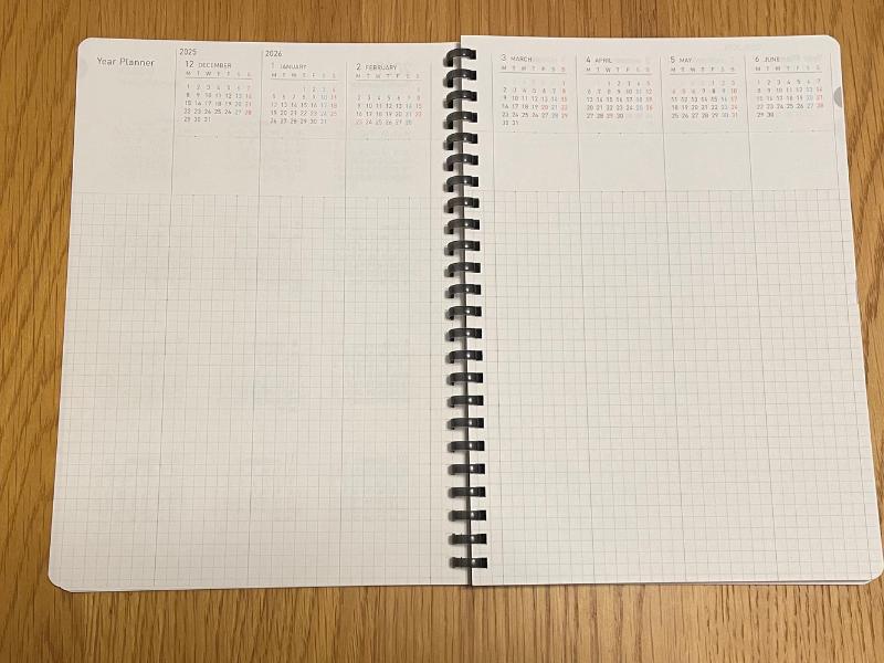 中身は、年間カレンダー、イヤープランナー、月間カレンダー、そしてたっぷり121ページの方眼ノート。