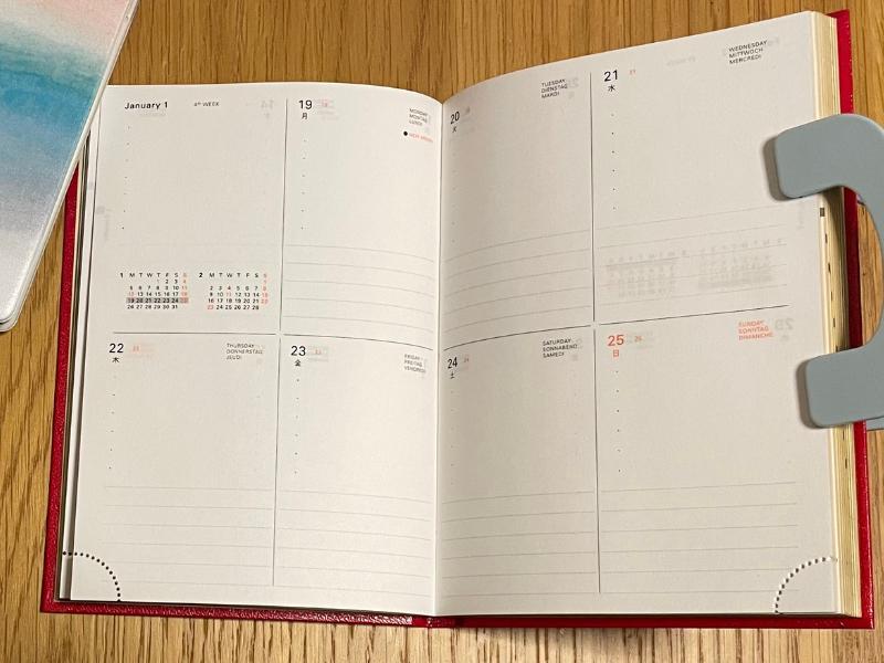 見開きで7日分になっていること、四角い形であることから、週間レフト式より書くスペースが広くなっています。