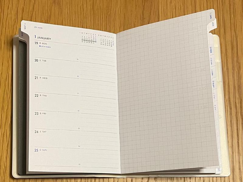 | レイアウト | 左:1週間の枠 右:フリーメモ | 見開き2ページが7日分のブロックで区切られている。 |