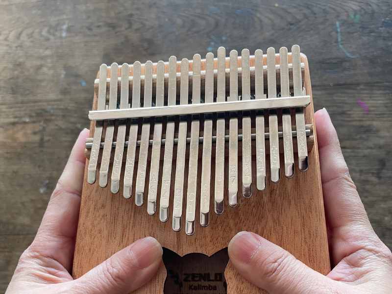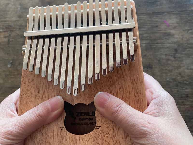 カリンバは両手で持って、親指でキーをはじいて演奏する楽器です。